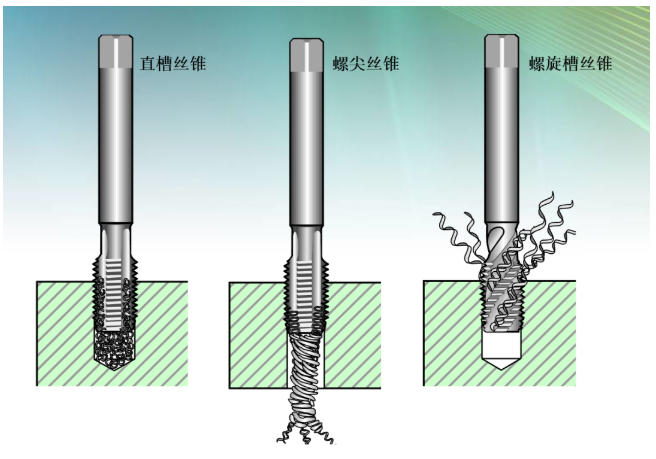 1、直槽絲錐:用于通孔及盲孔的加工,鐵屑存在于絲錐槽中,加工的螺紋質量不高,更常用于短屑材料的加工,如灰鑄鐵等;